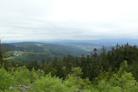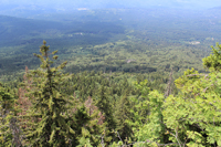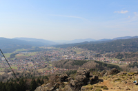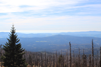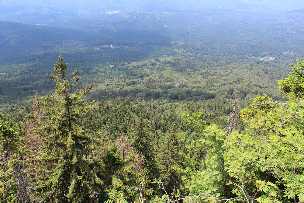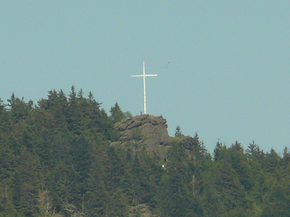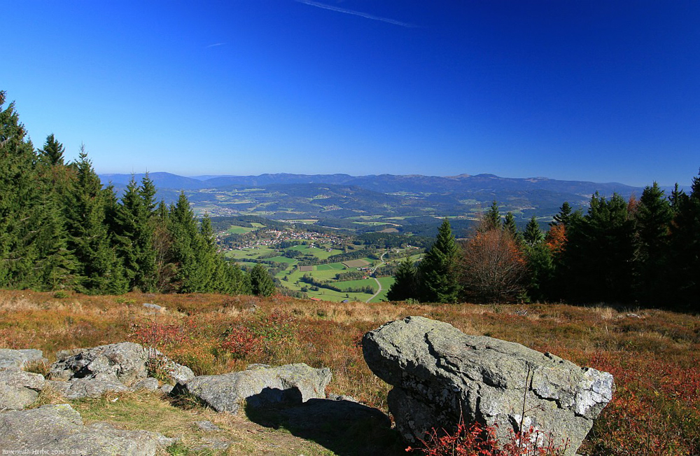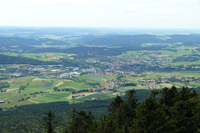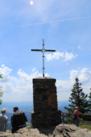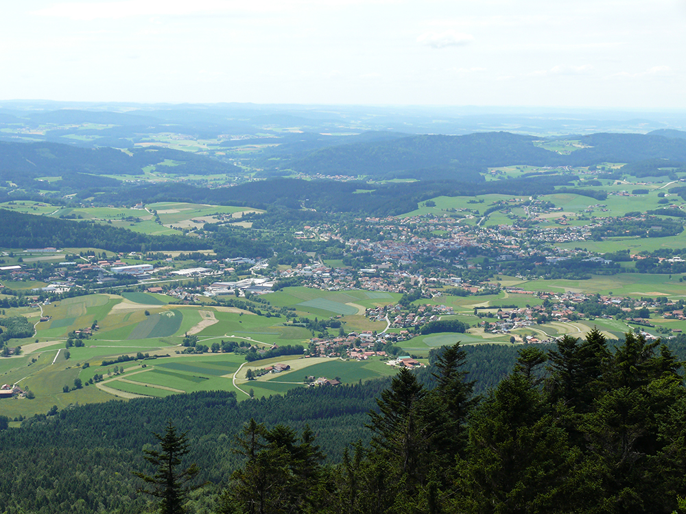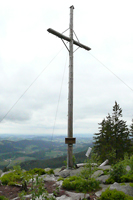 Vom Gipfelkreuz aus hat man einen weiten Ausblick nach Westen und Süden auf den Großen Arber, den Großen Osser, die Stadt Zwiesel.