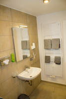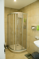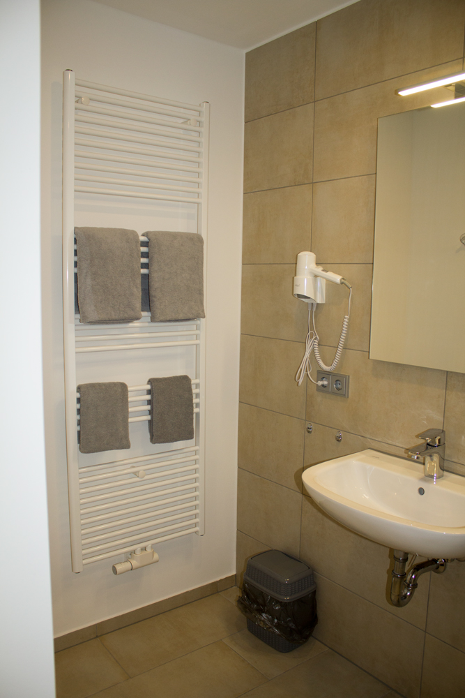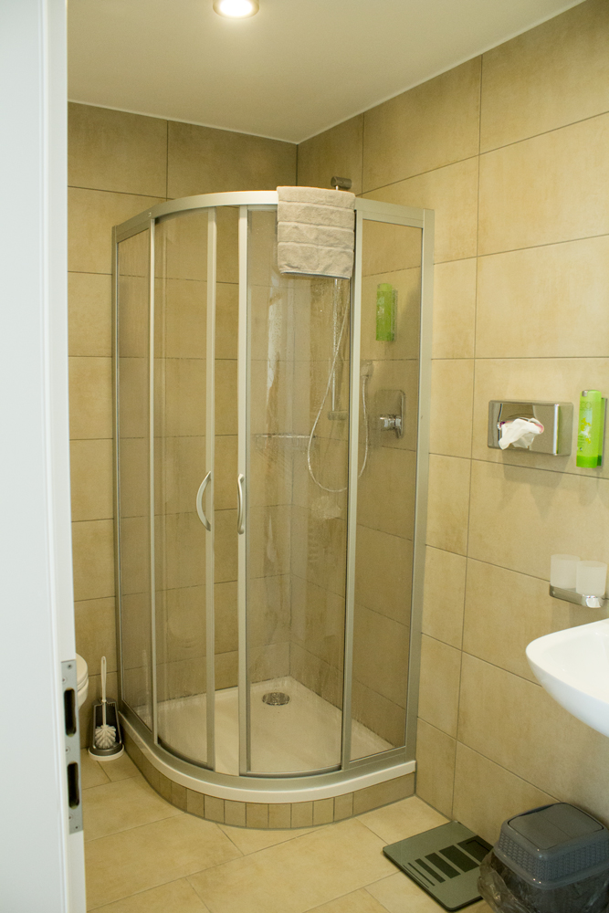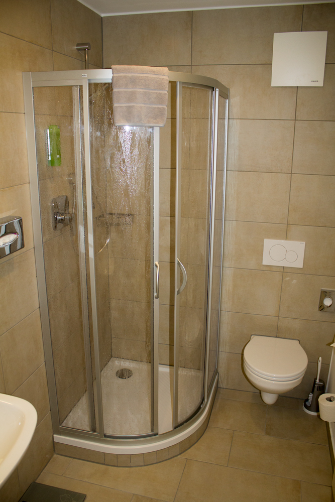 Bad mit Dusche & WC, sowie Spiegel, Zahnputzgläser,